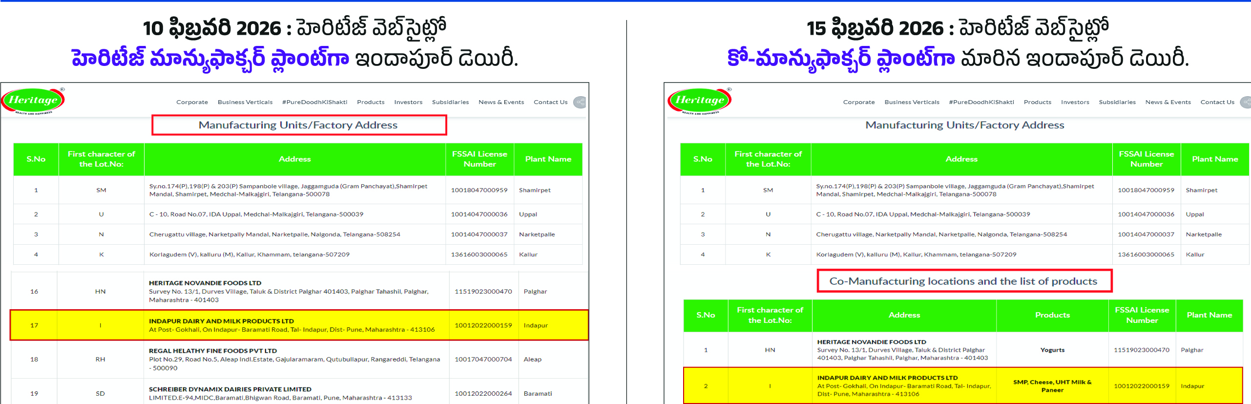 అంటే ఆ విధంగా లక్షల లీటర్ల నెయ్యి సరఫరా కాంట్రాక్టు దక్కించుకుంది. అంటే ఏ స్థాయిలో దోపిడీ చేస్తోందనేది విభ్రాంతి కలిగిస్తోంది. ఈ దందా బయట పడగానే చంద్రబాబు కుటుంబానికి చెందిన హెరిటేజ్ ఫుడ్స్ మాన్యుఫ్యాక్చరింగ్ యూనిట్ ఇందాపూర్ డెయిరీ అనే విషయాన్ని వెబ్సైట్లో తొలగించి, కో మాన్యుఫ్యాక్చరింగ్ సంస్థగా ఎడిట్ చేసింది.