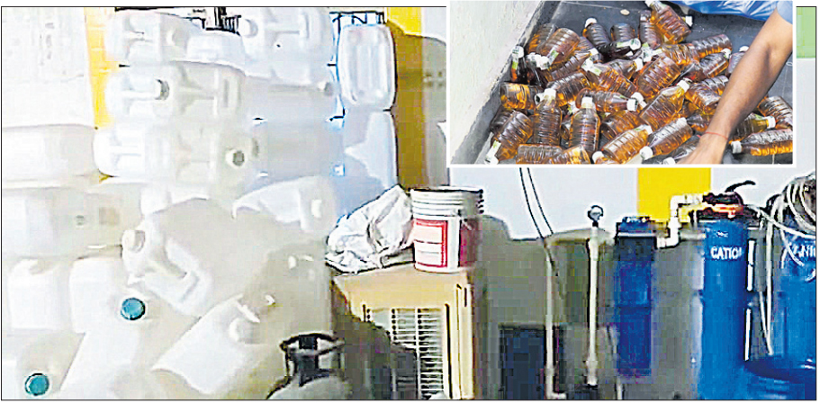 ఎన్టీఆర్ జిల్లా ఇబ్రహీంపట్నంలో టీడీపీ నేత పెట్టిన నకిలీ మద్యం ప్లాంటులోని యంత్రాలు, క్యాన్లు, (ఇన్సెట్లో) నకిలీ మద్యం బాటిళ్లు