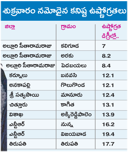 శుక్రవారం అల్లూరి సీతారామరాజు జిల్లా ముంచంగిపుట్టు మండలం కిలగూడలో 7 డిగ్రీల కనిష్ట ఉష్ణోగ్రత నమోదైంది. అరకు, పెదబయలు, పాడేరు, చింతపల్లి, వై.రామవరం, హుకుంపేట మండలాల్లో గత 20 రోజులుగా ఉష్ణోగ్రతలు పడిపోయాయి. కొన్నిచోట్ల 4 డిగ్రీల ఉష్ణోగ్రతలు నమోదయ్యాయి.