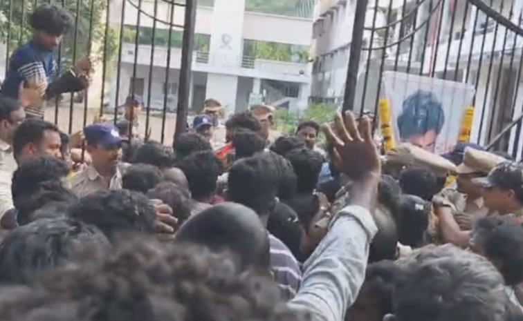 సాక్షి, విశాఖపట్నం: నగరంలోని సమతా కాలేజీ వద్ద ఉద్రిక్తత కొనసాగుతోంది. మహిళా లెక్చరర్ లైంగిక వేధింపులకు గురిచేశారనే కారణంతో విశాఖ సమతా కాలేజీలో డిగ్రీ ఫైనలియర్ విద్యార్థి సాయితేజ ఆత్మహత్య చేసుకున్న విషయం తెలిసిందే. న్యాయం చేయాలంటూ విద్యార్థులు ఆందోళనకు దిగారు. భవనంపై నుంచి దూకేస్తామని విద్యార్థులు హెచ్చరించారు.