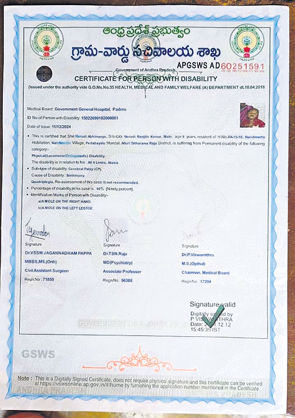పెదబయలు మండలం పర్రెడ పంచాయతీ నందిమెట్ట గ్రామానికి చెందిన నేరోడి రామారావు, వరలక్ష్మి దంపతుల కుమారుడు నేరోడి ఆకాష్ (8). ఆకాష్ లోకోమోటర్ ఆర్థోపెడిక్ వైకల్యంతో బాధపడుతున్నాడు. ఎముకలు, కండరాలు సహకరించక, నాడీ వ్యవస్థ బలహీనపడటంతో కనీసం అడుగు తీసి అడుగు వేయలేని పరిస్థితి. 2023లో సదరం సరి్టఫికెట్ కోసం దరఖాస్తు చేసుకోగా, వైద్యులు 90 శాతం వైకల్యం ఉందని నిర్ధారించారు. కానీ, ఆ 90 శాతం వైకల్యం సాక్షిగా రెండేళ్లుగా గ్రామ సచివాలయం చుట్టూ తిరుగుతున్నా, ఆకాష్కు వికలాంగ పింఛన్ మాత్రం మంజూరు కాలేదు. వస్తే చెబుతాం.. అనే సిబ్బంది సమాధానం ఆ తల్లిదండ్రుల గుండెలను పిండేస్తోంది.