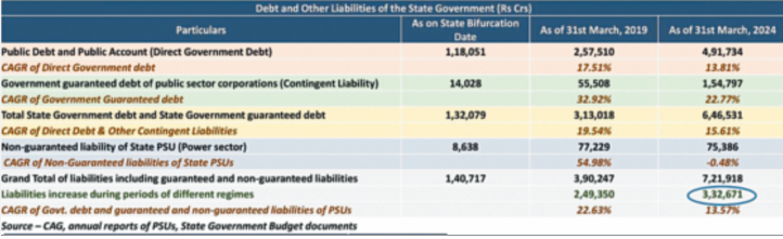 2019–24 మధ్య ఐదేళ్ల కాలంలో వైఎస్ జగన్ ప్రభుత్వం చేసిన అప్పులు రూ.3,32,671 కోట్లు కాగా, చంద్రబాబు ప్రభుత్వం ఈ 18 నెలల కాలంలో చేసిన అప్పులు రూ.2,66,175 కోట్లు.