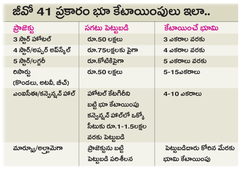 కొండలు, కోనలు, సముద్ర తీరం, ఘాట్ ప్రాంతాల్లోని భూములను పెట్టుబడుల పేరుతో సంతర్పణ చేసేందుకు రోడ్ మ్యాప్ రూపొందించింది. హోటళ్లు, రిసార్టులు, వెల్నెస్ సెంటర్లు, వినోద పార్కుల ఏర్పాటుకు, టెండర్లు, బిడ్లతో పని లేకుండా డీపీఆర్ ఆధారంగా భూములు కట్టబెట్టి ప్రోత్సాహకాలు విడుదలకు ఏకంగా జీవో 41 విడుదల చేయడం చర్చనీయాంశమైంది. భూ కేటాయింపులపై తాజాగా యూనిఫాం ఫ్రేమ్వర్క్ విడుదలైంది.