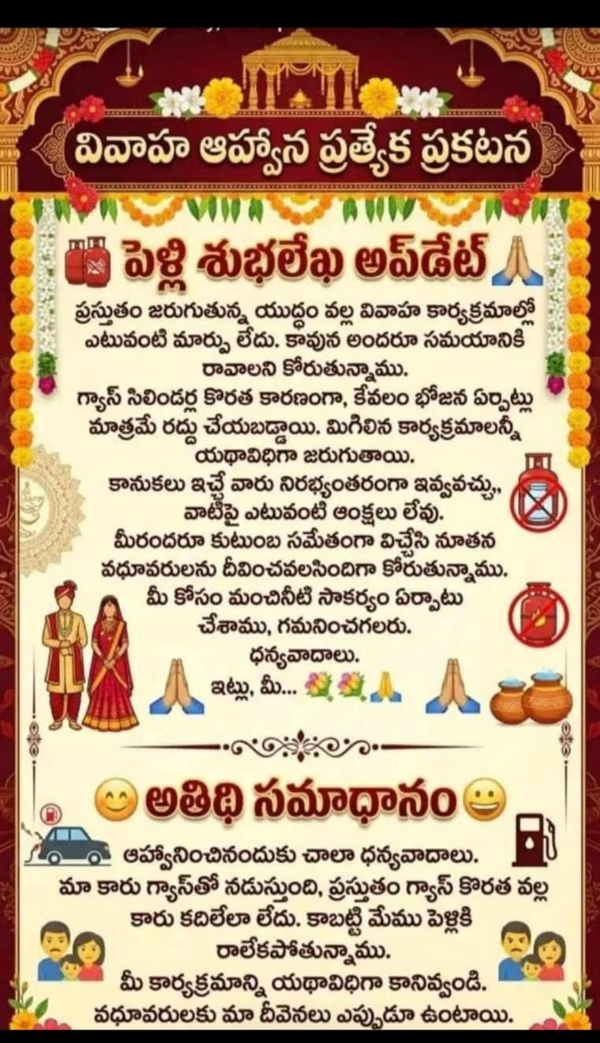 ప్రస్తుతం జరుగుతన్న యుద్ధం వల్ల వివాహ కార్యక్రమాల్లో ఎటువంటి మార్పు లేదని, కావున బంధు, మిత్రులు అందరూ వివాహ కార్యక్రమానికి సకాలంలో హాజరు కావాలని కోరుతున్నాం. గ్యాస్ సిలిండర్లు కొరత వల్ల కేవలం భోజనం ఏర్పాట్లు మాత్రమే రద్దు చేయబడ్డాయి. మిగిలిన కార్యక్రమాలు యథావిధిగా జరుగుతాయి. కానుకలు ఇచ్చేవారు నిరభ్యంతరంగా ఇవ్వొచ్చు.. వాటిపై ఎటువంటి ఆంక్షలు లేవు.. మీరంతా కుటుంబ సమేతంగా విచ్చేసి నూతన వధూవరులను దీవించవలసినదిగా కోరుతున్నాము. మీ కోసం మంచినీటి సౌకర్యం ఏర్పాటు చేశాం.. గమనించగలరు ధన్యవాదాలు అంటూ.. ఆహ్వానించగా దానికి బదులుగా బందువులు ఈ విధంగా బదులిచ్చారు..