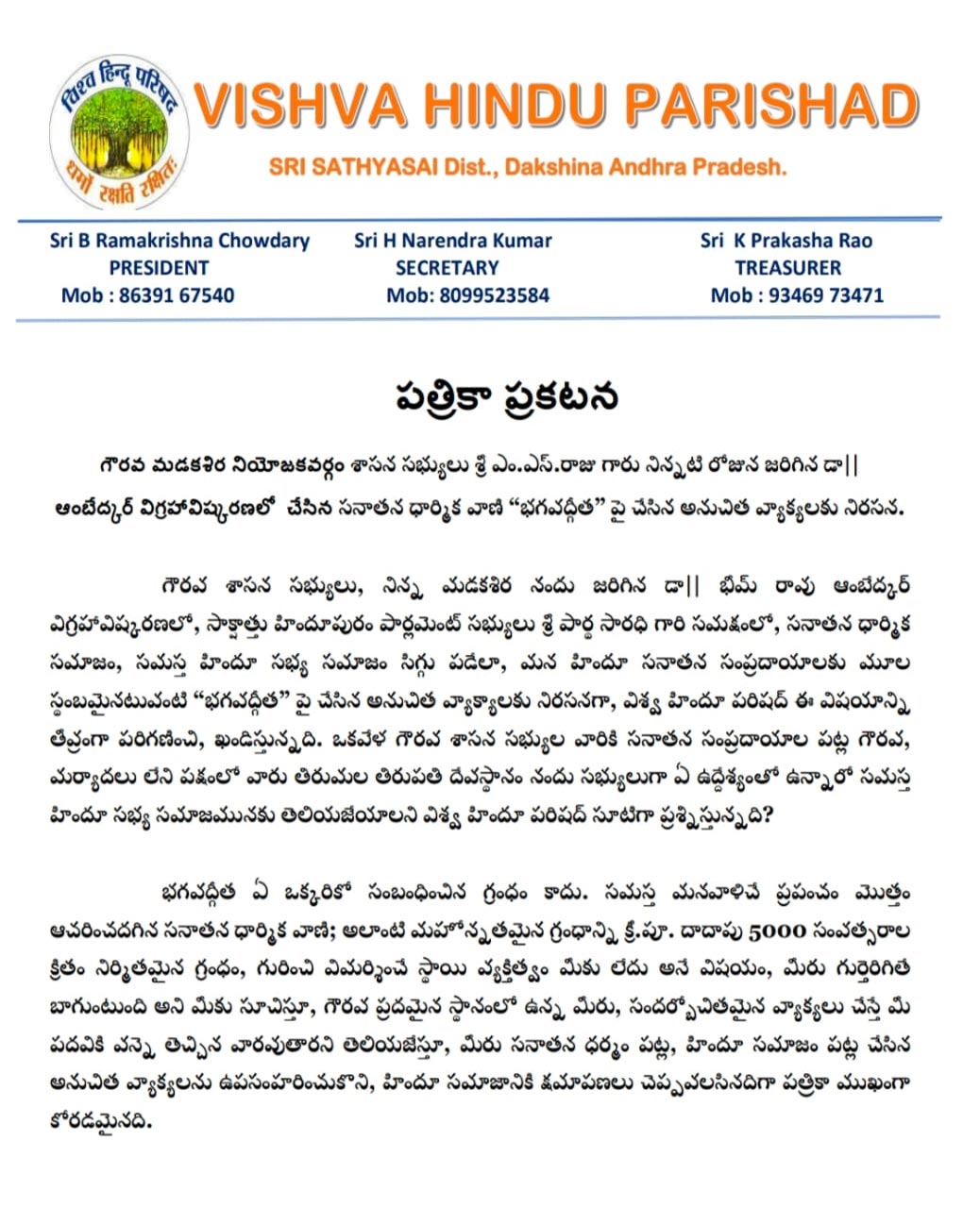 ఇంతకీ ఏం జరిగిందంటే.. టీడీపీ ఎమ్మెల్యే, టీటీడీ(TTD Board) బోర్డు సభ్యుడు ఎంఎస్ రాజు తాజాగా ఓ కార్యక్రమంలో మాట్లాడుతూ..‘భగవద్గీత ప్రజల బతుకులను మార్చలేదంటూ వ్యాఖ్యలు చేశారు. దీంతో, ఆయన వ్యాఖ్యలు సోషల్ మీడియాలో వైరల్ అయ్యాయి. టీటీడీ బోర్డు సభ్యుడిగా ఉంటూ భగవద్గీతపై అనుచిత వ్యాఖ్యలు చేయడంతో సర్వత్రా విమర్శలు వచ్చాయి. ఇక, తాజాగా టీడీపీ ఎమ్మెల్యే ఎంఎస్ రాజు వ్యాఖ్యలపై విశ్వహిందూ పరిషత్ నేతలు స్పందించారు. ఈ సందర్బంగగా ఎమ్మెల్యే ఎంఎస్ రాజు బహిరంగ క్షమాపణలు చెప్పాలని డిమాండ్ చేశారు. ఇదే సమయంలో ఆయనకు టీటీడీ బోర్డు సభ్యుడిగా కొనసాగే అర్హత లేదు అంటూ ఘాటు విమర్శలు చేశారు.