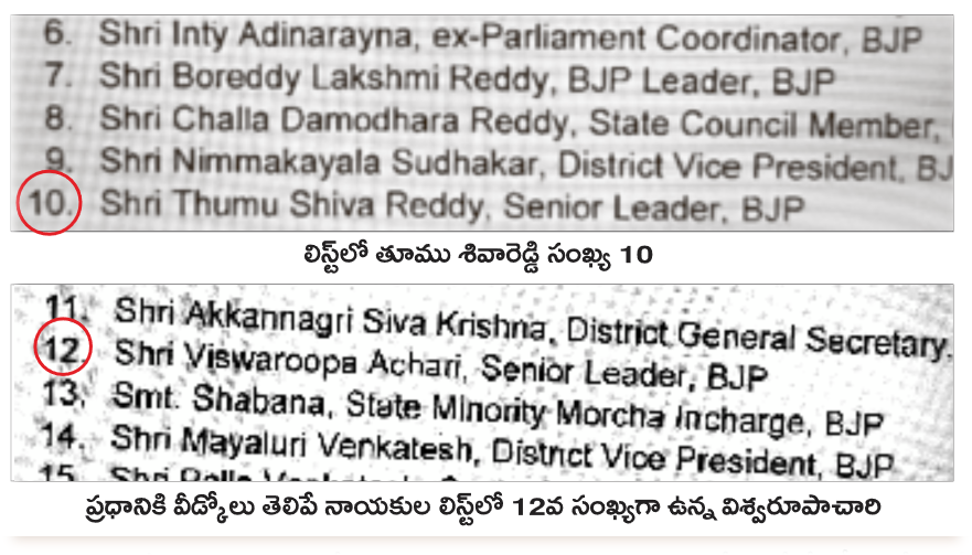 ఇలా ఎంతమంది మరొకరి పేరుతో వీఐపీల కోటాలో ప్రధాని భద్రతా వలయంలోకి చేరారోనన్న అనుమానం కలుగుతోంది. ప్రధానికి వీడ్కోలు తెలిపేందుకు ఎంపికైన నాయకుల జాబితాలో తూము శివారెడ్డి సంఖ్య 10 కాగా.. విశ్వరూపాచారి సంఖ్య 12. జాబితాలో పేర్లు సక్రమంగా ఉన్నప్పటికీ పాస్లు వేరే వారు తీసుకుని రావడంపై దర్యాప్తు జరపాలని పలువురు కోరుతున్నారు. పాస్లను మార్చేందుకు ఆధార్ను టాంపరింగ్ చేసి ఫొటోలు మార్చి ఉంటారనే అనుమానం కలుగుతోంది.
