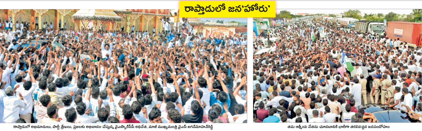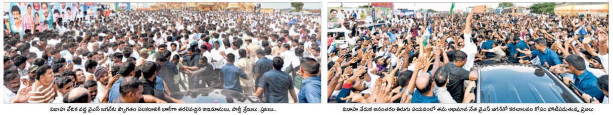 రాప్తాడు/రాప్తాడు రూరల్: ఉప్పొంగిన అభిమాన జన సంద్రంతో రాప్తాడు ప్రాంతం కిక్కిరిసిపోయింది. జై జగన్ నినాదాలతో హోరెత్తిపోయింది. అభిమాన నేతను చూసేందుకు.. చేయి కలిపేందుకు.. సెల్ఫీలు దిగేందుకు ప్రజలు, అభిమానులు పెద్ద ఎత్తున పోటీపడ్డారు. వైఎస్సార్సీపీ నేత, మాజీ ఎమ్మెల్యే తోపుదుర్తి ప్రకాష్రెడ్డి సోదరుడు తోపుదుర్తి రాజశేఖర్రెడ్డి కుమార్తె డాక్టర్ మోక్షితా విష్ణుప్రియారెడ్డి, డాక్టర్ తేజేష్రెడ్డి వివాహ వేడుక ఆదివారం అనంతపురం జిల్లా రాప్తాడు సమీపంలో ఘనంగా జరిగింది. ఈ వేడుకకు వైఎస్ జగన్ వస్తున్నారని తెలుసుకున్న ప్రజలు, అభిమానులు భారీగా తరలివచ్చారు.