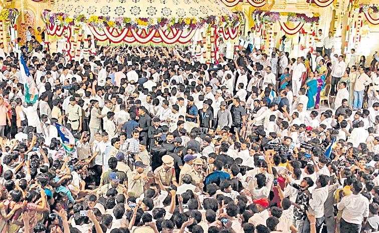 రాప్తాడు/రాప్తాడు రూరల్: ఉప్పొంగిన అభిమాన జన సంద్రంతో రాప్తాడు ప్రాంతం కిక్కిరిసిపోయింది. జై జగన్ నినాదాలతో హోరెత్తిపోయింది. అభిమాన నేతను చూసేందుకు.. చేయి కలిపేందుకు.. సెల్ఫీలు దిగేందుకు ప్రజలు, అభిమానులు పెద్ద ఎత్తున పోటీపడ్డారు. వైఎస్సార్సీపీ నేత, మాజీ ఎమ్మెల్యే తోపుదుర్తి ప్రకాష్రెడ్డి సోదరుడు తోపుదుర్తి రాజశేఖర్రెడ్డి కుమార్తె డాక్టర్ మోక్షితా విష్ణుప్రియారెడ్డి, డాక్టర్ తేజేష్రెడ్డి వివాహ వేడుక ఆదివారం అనంతపురం జిల్లా రాప్తాడు సమీపంలో ఘనంగా జరిగింది. ఈ వేడుకకు వైఎస్ జగన్ వస్తున్నారని తెలుసుకున్న ప్రజలు, అభిమానులు భారీగా తరలివచ్చారు.