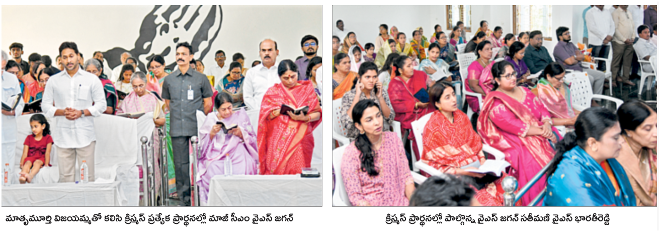 పులివెందుల: మాజీ సీఎం, వైఎస్సార్సీపీ అధ్యక్షులు వైఎస్ జగన్మోహన్రెడ్డి వైఎస్సార్ జిల్లా పులివెందులలోని సీఎస్ఐ చర్చిలో ప్రత్యేక ప్రార్థనలు చేశారు.అక్కడికి హాజరైన వారిని ఆప్యాయంగా, చిరునవ్వుతో పలకరించారు. కుటుంబ సభ్యులతో కలిసి గురువారం ఉదయం క్రిస్మస్ ప్రత్యేక ప్రార్థనలలో వైఎస్ జగన్ పాల్గొన్నారు. ఈ సందర్భంగా మాజీ సీఎం వైఎస్ జగన్ ఇక్కడికి విచ్చేసిన బంధువర్గానికి, స్నేహితులు, ఆప్తులు, అభిమానులకు క్రిస్మస్ పర్వదినం, ముందస్తు నూతన సంవత్సర శుభాకాంక్షలు తెలియజేశారు.