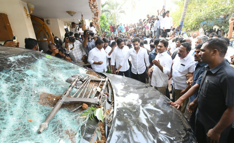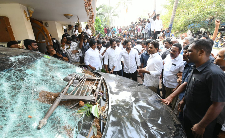 బుధవారం వైఎస్ జగన్ గుంటూరు పర్యటన జన సందోహం నడుమ సాగింది. సాయంత్రం అంబటి నివాసానికి చేరుకున్న వైఎస్ జగన్.. తొలుత టీడీపీ రౌడీమూకల దాడిలో ధ్వంసమైన ఇంటిని, ఆఫీస్ను పరిశీలించారు. ఆ తర్వాత అంబటి కుటుంబ సభ్యులను కలిసి దాడి జరిగిన తీరును అడిగి తెలుసుకున్నారు. అధైర్య పడొద్దని.. పార్టీ అండగా ఉంటుందని భరోసా ఇచ్చారు. ఆ సమయంలో జగన్ వెంట పార్టీ ముఖ్య నేతలు పలువురు ఉన్నారు.