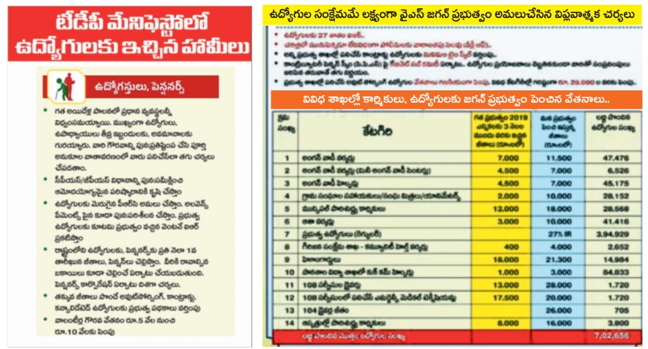 ప్రతి నెల ఒకటో తేదీనే ఉద్యోగులకు జీతాలు, పెన్షన్లు ఇస్తామని చంద్రబాబు హామీ ఇచ్చి... ఇప్పుడు ఏ తేదీన జీతాలు, పెన్షన్లు ఇస్తారో తెలియని పరిస్థితి తెచ్చారు. ప్రతి నెల ఉద్యోగులు జీతాల కోసం ఎదురుచూడాల్సిన దుస్థితి. కరోనా వల్ల తలెత్తిన ఆర్థిక సంక్షోభాల సమయంలోనూ మేం ఉద్యోగులకు జీతాలు సకాలంలోనే ఇవ్వగలిగాం. కానీ, ఆ రోజు మాపై మీరు తప్పుడు ప్రచారాలు చేశారు. ఇవాళ కరోనా లాంటి దారుణమైన పరిస్థితులు లేకపోయినా జీతాలు ఇవ్వలేకపోతున్నారు. ఔట్ సోర్సింగ్, కాంట్రాక్ట్ ఉద్యోగులకు ప్రభుత్వ పథకాలను వర్తింపజేస్తామని హామీ ఇచ్చి, ఇప్పటికీ అమలు చేయడం లేదు.