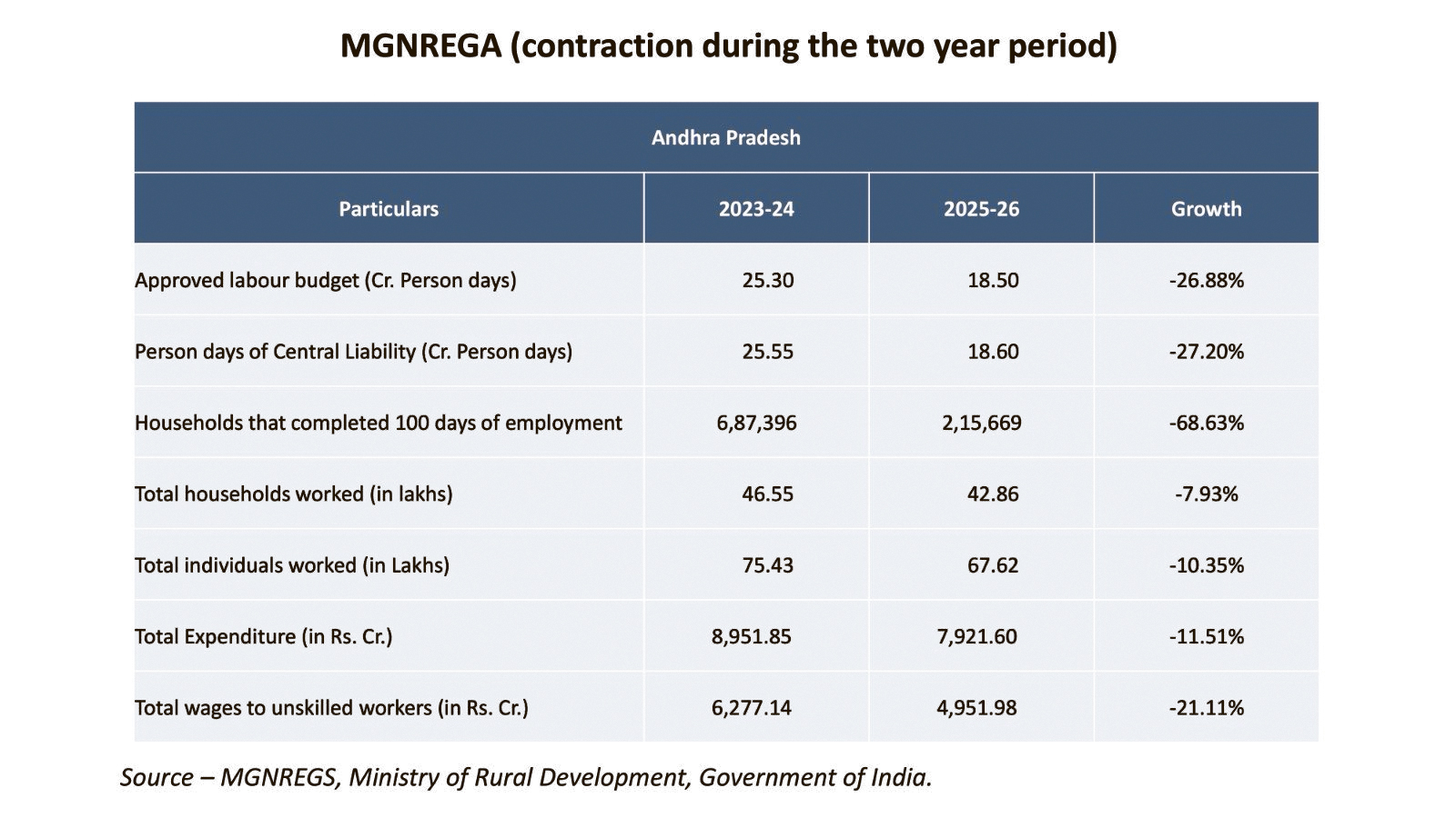 2023–24తో పోల్చితే 2025–26లో రాష్ట్రంలో గణనీయంగా తగ్గిన ఉపాధి పనులు, వేతనాల వృద్ధి రేటు వివరాలు