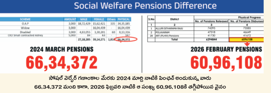 » మిగిలిన పథకాల అమలు తీరు కూడా అరకొరే. ప్రతి నెలా పింఛన్ల పంపిణీనే చూడండి. చంద్రబాబు పబ్లిక్ మీటింగ్లు పెడుతూ ప్రతి నెలా పచ్చి అబద్ధాలు చెబుతూ ప్రతి మీటింగ్కు 25 వేల పింఛన్లు కట్ చేస్తున్నాడు. 2024 ఎన్నికల నాటికి అంటే మార్చి నాటికి రాష్ట్రంలో పింఛన్ల సంఖ్య 66,34,372 కాగా, 2026 ఫిబ్రవరిలో 60,96,108 మందికి ఫించన్లు ఇచ్చారు. అంటే ఏకంగా 5,38,634 మందికి పింఛన్లు కట్ చేశాడు.