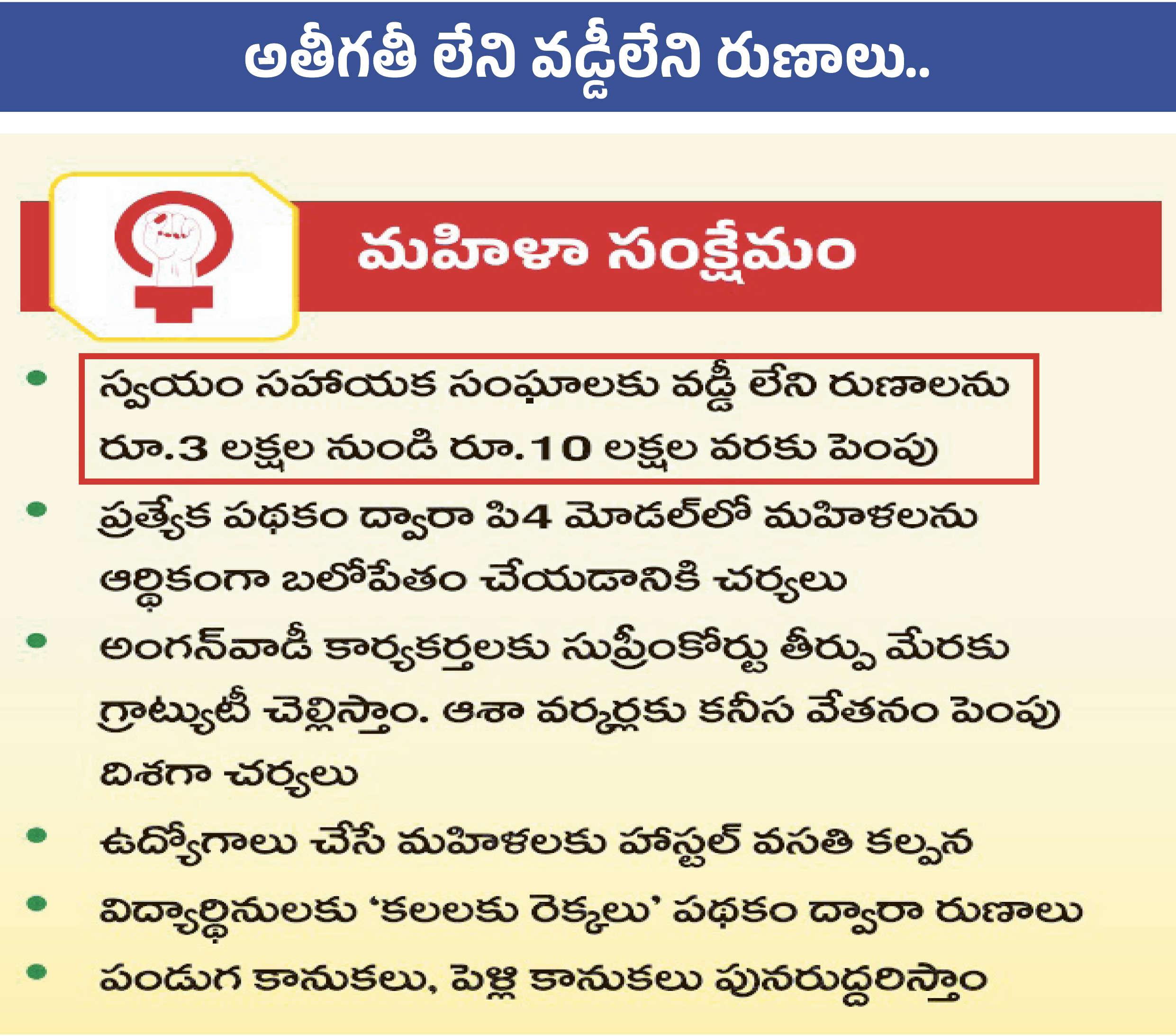 స్వయం సహాయ సంఘాలకు వడ్డీ లేని రుణాలను రూ.3 లక్షల నుంచి రూ.10 లక్షలకు పెంచుతామంటూ చంద్రబాబు మేనిఫెస్టోలో ఇచ్చిన హామీ