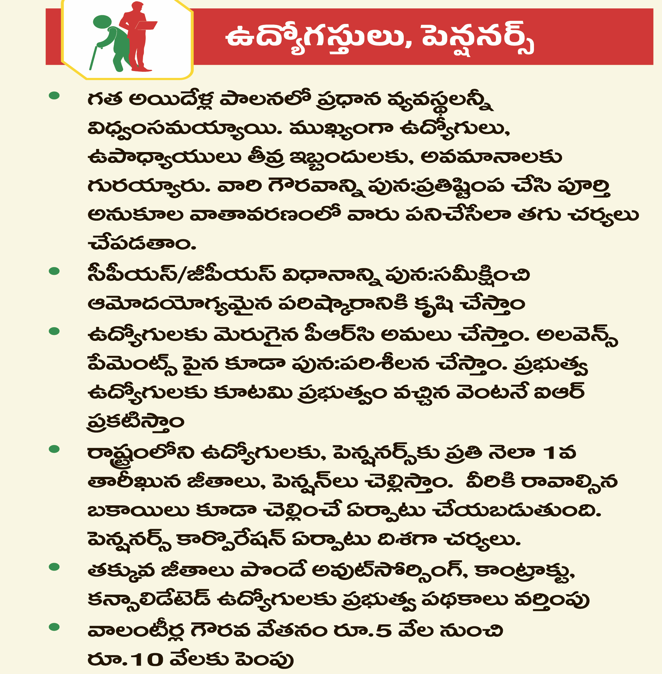 ఉద్యోగులకు మెరుగైన పీఆర్సీ, ఐఆర్, అలవెన్స్ చెల్లింపు తదితరాలపై మేనిఫెస్టోలో చంద్రబాబు ఇచ్చిన హామీలు..