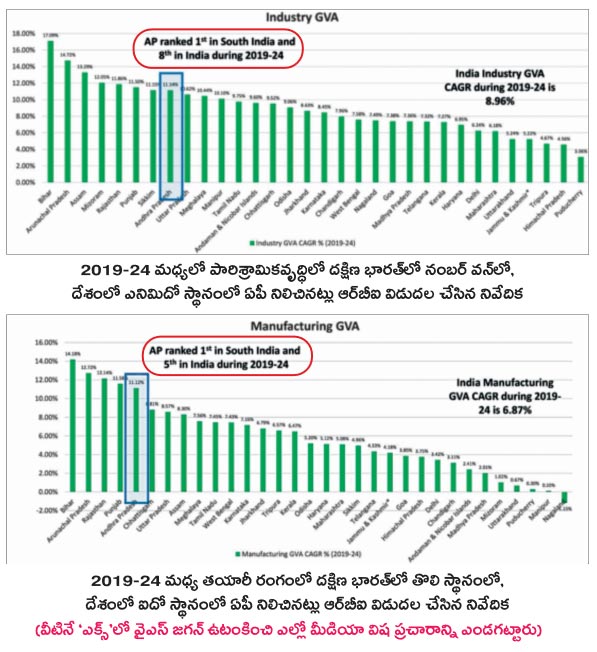 కానీ.. వాస్తవాలు అందుకు భిన్నంగా ఉన్నాయి. తయారీ, పరిశ్రమల రంగంలో స్థూల విలువను జోడిస్తూ ఆర్బీఐ ఈ నెల విడుదల చేసిన గణాంకాలను పరిశీలిస్తే ఇది స్పష్టమవుతుంది. తయారీ రంగం వృద్ధిలో దక్షిణ భారతదేశంలో ఆంధ్రప్రదేశ్ నంబర్ వన్.. దేశ వ్యాప్తంగా ఐదో స్థానంలో ఉంది. పారిశ్రామికాభివృద్ధిలో దక్షిణ భారతదేశంలో ఆంధ్రప్రదేశ్ నంబర్ వన్.. దేశ వ్యాప్తంగా ఎనిమిదో స్థానంలో ఉంది. ఇప్పుడు చెప్పండి.. 2019–24 మధ్య ఏపీ బ్రాండ్ దెబ్బతిందా? సమర్థవంతమైన నాయకత్వం వల్ల ఇంతకుముందెన్నడూ చూడని ఆర్థిక పురోగతిని చూశామా?