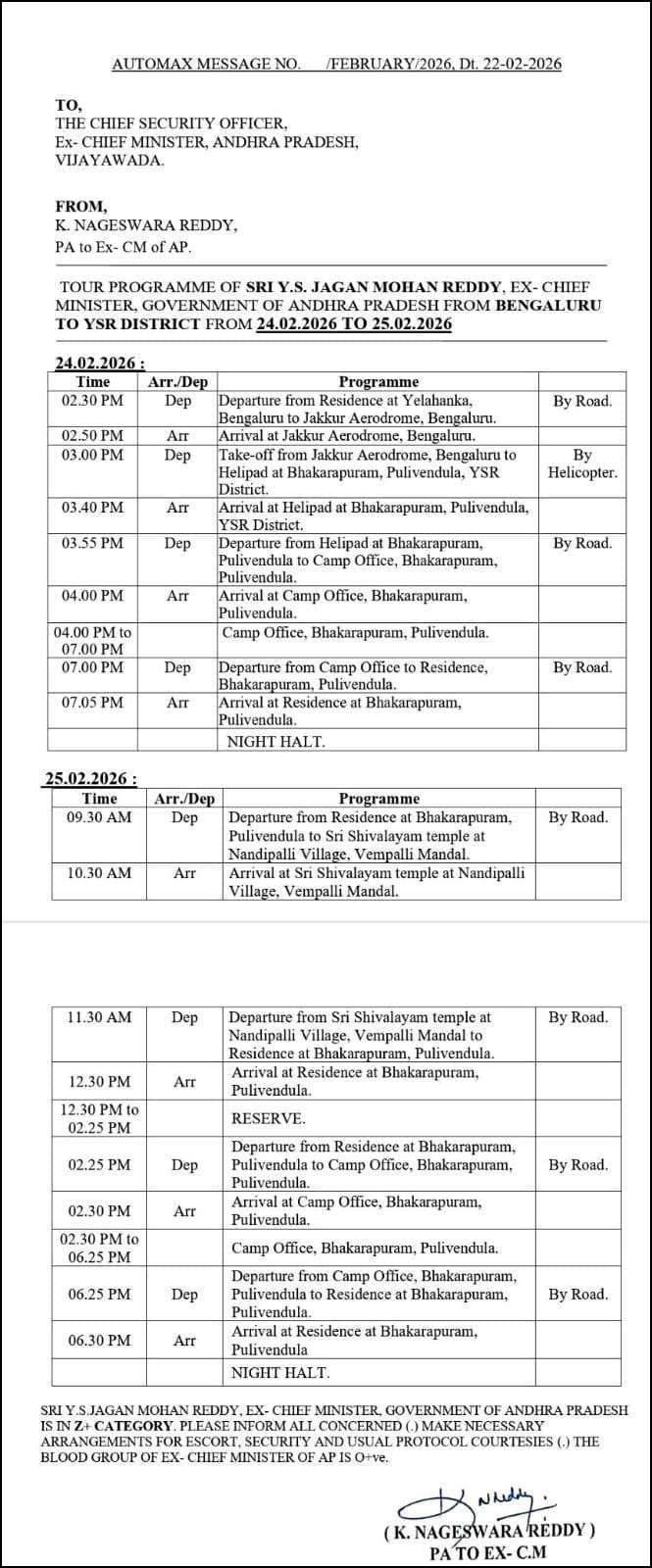 వైఎస్సార్సీపీ అధినేత వైఎస్ జగన్ రేపు(మంగళవారం) పులివెందుల చేరుకున్నారు. ఈ క్రమంలో పులివెందుల క్యాంప్ కార్యాలయంలో ప్రజాదర్భార్లో పాల్గొంటారు. అలాగే, ఎల్లుండి(బుధవారం) వేంపల్లి మండలం నందిపల్లికి వైఎస్ జగన్ వెళ్లనున్నారు. నందిపల్లిలో నందీశ్వర ఆలయ విగ్రహ ప్రతిష్ఠా మహోత్సవంలో ఆయన పాల్గొంటారు. అనంతరం, మధ్యాహ్నం పులివెందుల క్యాంప్ ఆఫీస్లో ప్రజాదర్బార్కు వైఎస్ జగన్ హాజరు అవతారు.
