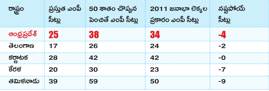 » 50 శాతం సీట్ల పెంపుదల విధానాన్ని అమలు చేస్తే ప్రస్తుతం ఏపీలో ఉన్న 25 ఎంపీ సీట్లు 38 సీట్లకు పెరుగుతాయి. అదే 2011 జనాభా లెక్కలను పరిగణనలోకి తీసుకుంటే ఎంపీ సీట్లు 34 మాత్రమే అవుతాయి. అంటే ఏపీ 4 ఎంపీ సీట్లు నష్టపోతుంది.