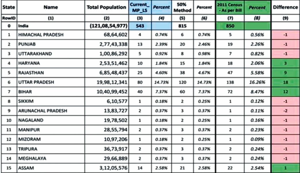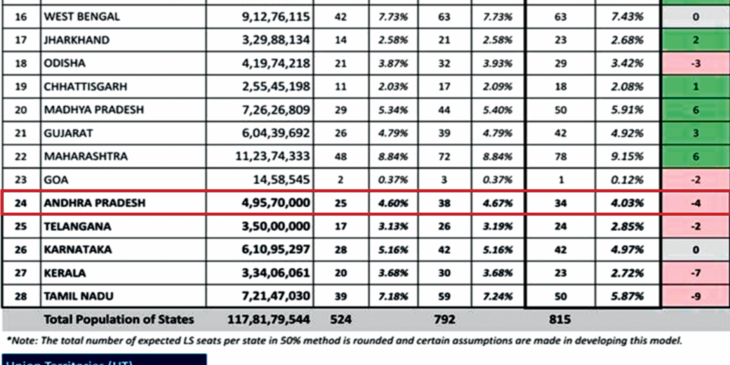» కేంద్ర ప్రభుత్వం ప్రతిపాదించిన 50 శాతం సీట్ల పెంపుదల విధానంలో దక్షిణాది రాష్ట్రాల్లో ఎంపీ సీట్లు పెరిగేవి. అదే 2011 జనాభా లెక్కలను పరిగణలోకి తీసుకుంటే దక్షిణాది రాష్ట్రాల్లో ఎంపీ సీట్లు తగ్గుతాయి. ఇక 2026 జనాభా లెక్కలు అమలులోకి వస్తే దక్షిణాది రాష్ట్రాల పరిస్థితి మరింతగా దిగజారుతుంది. కుటుంబ నియంత్రణను సమర్థంగా అమలు చేసినందుకు జనాభా పెరుగుదల తగ్గిన దక్షిణాది రాష్ట్రాలు మరింతగా నష్టపోతాయి.
