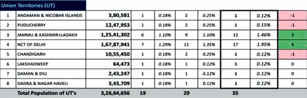 » 50 శాతం సీట్ల పెంపుదల విధానం అమలు చేస్తే ప్రస్తుతం కేరళలో ఉన్న 20 ఎంపీ సీట్లు 30 సీట్లకు పెరుగుతాయి. అదే 2011 జనాభా లెక్కలను పరిగణనలోకి తీసుకుంటే ఎంపీ సీట్లు 23 మాత్రమే అవుతాయి. అంటే కేరళ 7 ఎంపీ సీట్లు నష్టపోతుంది.