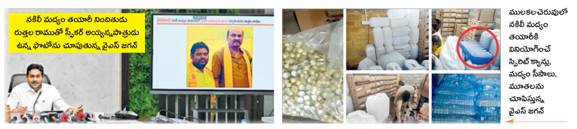 » అనకాపల్లి జిల్లా పరవాడలో చిన్న సైజ్ నకిలీ మద్యం ఫ్యాక్టరీ. అవే స్టిక్కర్లు, లేబుళ్లు, బాటిళ్లతో తయారు చేస్తున్నారు. ఇక్కడ స్పీకర్ అయ్యన్నపాత్రుడు సన్నిహితుడు రుత్తల రాము నకిలీ మద్యంలో కీలక సూత్రధారి. అమలాపురం, పాలకొల్లు, ఏలూరు, రేపల్లె, నెల్లూరు ఇలా అన్ని చోట్ల ఒకే రకమైన సీన్ కనిపిస్తోంది. ప్రతి చోటా నకిలీ మద్యం బాటిళ్లు, మెషీన్లు, కార్టన్లు, లేబుళ్లతో సహా దొరికాయి. రాష్ట్ర వ్యాప్తంగా ప్రతి నాలుగైదు మద్యం బాటిళ్లలో ఒకటి నకిలీ.