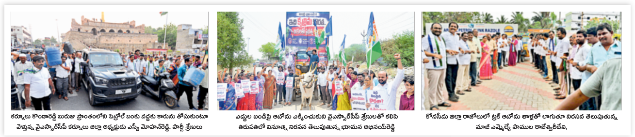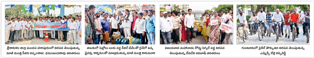 ⇒ కోనసీమజిల్లా కొత్తపేటలో డీజిలు లేక ఆగిపోయిన రైతు ట్రాక్టరుకు పగ్గం కట్టి బంకు వద్దకు తీసుకువచ్చి వినూత్న నిరసన తెలిపారు. జిల్లాలోని అన్ని నియోజకవర్గాల్లోనూ నేతలు నిరసన గళమెత్తారు. కొన్ని ప్రాంతాల్లో మోటార్సైకిళ్లతో నిరసన తెలిపారు. రాజోలులో ట్రక్కు ఆటోను తాళ్లతో లాగి నిరసన తెలిపారు.