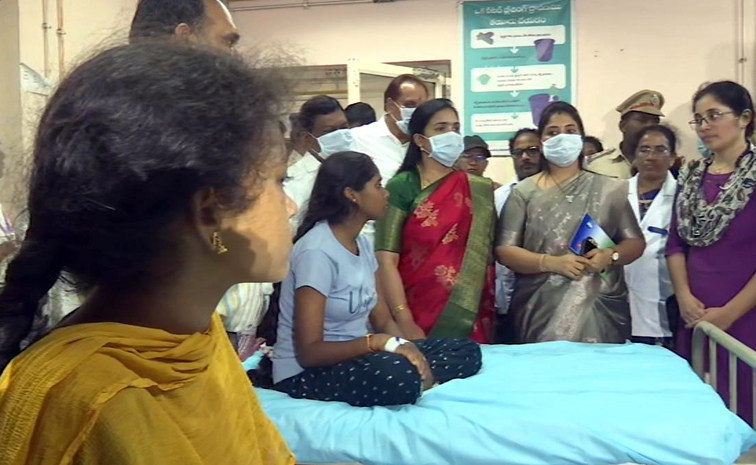 సాక్షి, విశాఖపట్నం: కేజీహెచ్లో గిరిజన బాలికలను వైఎస్సార్సీపీ నేతలు పరామర్శించారు. పచ్చ కామెర్లకు చికిత్స పొందుతున్న బాలికలను ఆ పార్టీ నేతలు పుష్పశ్రీవాణి, రాజన్నదొర, ఎంపీ తనూజారాణి, మజ్జి శ్రీను పరామర్శించి.. బాలికల తల్లిదండ్రులతో మాట్లాడి వివరాలు అడిగి తెలుసుకున్నారు. మెరుగైన వైద్యం అందించాలని వైద్యులను వారు కోరారు.