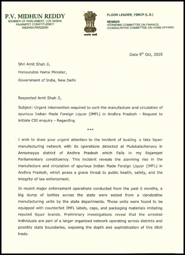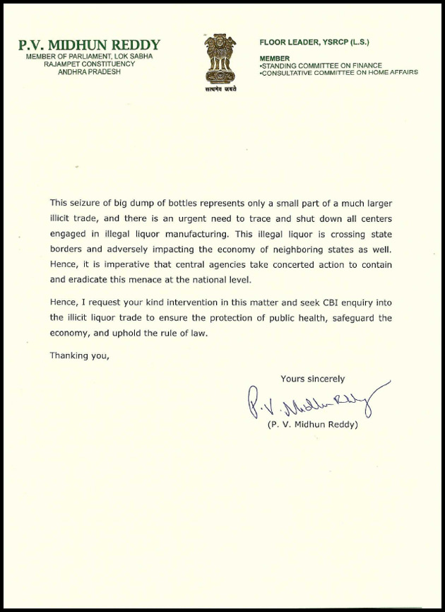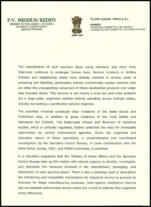 ఈ కేసును కేంద్ర హోంశాఖ ఎన్సీబీకి అప్పగించాలి. కల్తీ మద్యం రాకెట్ను ఛేదించాలి. ఇండస్ట్రియల్ ఆల్కహాల్ దారి తప్పకుండా తగిన కఠిన చర్యలు తీసుకోవాలి. రాష్ట్రంలో పట్టుబడిన భారీ లిక్కర్ డంపు అక్రమ మద్యం రాకెట్ లో చిన్న భాగం మాత్రమే. నకిలీ మద్యం పక్క రాష్ట్రాల్లో కూడా సప్లై చేస్తున్నారు. జాతీయ స్థాయిలో ఈ కల్తీ మద్యాన్ని నిరోధించేందుకు కేంద్ర దర్యాప్తు సంస్థలు వెంటనే రంగంలోకి దిగాలి. ఈ నేపథ్యంలో ఈ కల్తీ మద్యం వ్యాపారం కేసుపై సిబిఐ దర్యాప్తు చేయించాలి. ప్రజల ప్రాణాలను కాపాడాలి’ అని లేఖలో కోరారు ఎంపీ మిథున్రెడ్డి.