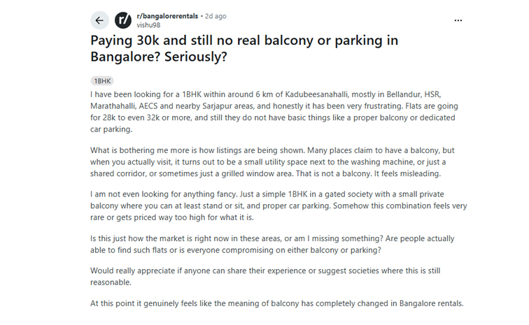 ఫ్లాట్లు రూ.28 వేల నుంచి రూ.32 వేలు లేదా అంతకంటే ఎక్కువ ధరకే లభిస్తున్నాయి, అయినా కూడా వాటిలో సరైన బాల్కనీ లేదా ప్రత్యేక కార్ పార్కింగ్ వంటి ప్రాథమిక సౌకర్యాలు కూడా లేవు. నన్ను మరింత ఇబ్బంది పెడుతున్న విషయం ఏమిటంటే, ఇళ్లను చూపించే విధానం. చాలా చోట్ల బాల్కనీ ఉందని చెబుతారు, కానీ మీరు నిజంగా వెళ్ళినప్పుడు, అది వాషింగ్ మెషీన్ పక్కన ఉండే ఒక చిన్న పని ప్రదేశంలా ఉంది. ఇది తప్పుదోవ పట్టిస్తున్నట్లుగా అనిపిస్తుందని అతడు వెల్లడించాడు.