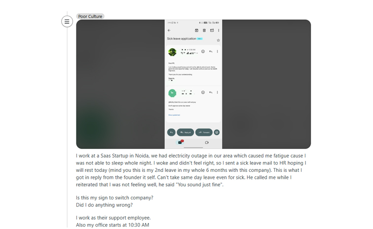 అయినప్పటికీ.. అతను ఊహించని విధంగా కంపెనీ ఫౌండర్ స్వయంగా ఆ ఈమెయిల్కు స్పందించారు. ఆ ఉద్యోగికి ఒకరోజు జీతం కోత పెట్టాలని HRకు సూచించారు. అదే రోజు సెలవు తీసుకోవడం కుదరదని కూడా చెప్పారు. అంతే కాకుండా.. ఫౌండర్ ఆ ఉద్యోగికి ఫోన్ చేసి మాట్లాడారు. ఉద్యోగి తాను అస్వస్థంగా ఉన్నానని చెప్పినా, ఫౌండర్ 'నీ వాయిస్ చూస్తే నువ్వు బాగానే ఉన్నట్టు అనిపిస్తోంది' అని చెప్పారు. ఇది ఆ ఉద్యోగికి చాలా బాధ కలిగించింది.