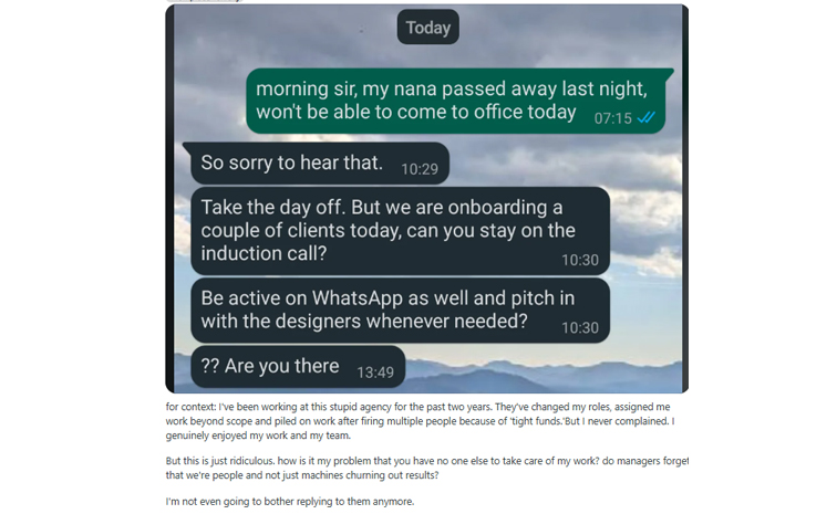 నా తాత ఉదయం చనిపోయారు, నాకు సెలవు కావాలని ఉద్యోగి వాట్సాప్ ద్వారా అడిగారు. దీనికి మేనేజర్ సమాధానం ఇస్తూ.. నేను సంతాపం వ్యక్తం చేస్తున్నాను. నువ్వు సెలవు తీసుకో.. కానీ వాట్సాప్లో అందుబాటులో ఉంటావా?, అవసరమైనప్పుడల్లా డిజైనర్లకు అందుబాటులో ఉంటావా? అని రిప్లై ఇచ్చాడు. ఈ సంభాషణకు సంబంధించిన స్క్రీన్ షాట్స్ ప్రస్తుతం సోషల్ మీడియాలో వైరల్ అవుతున్నాయి.