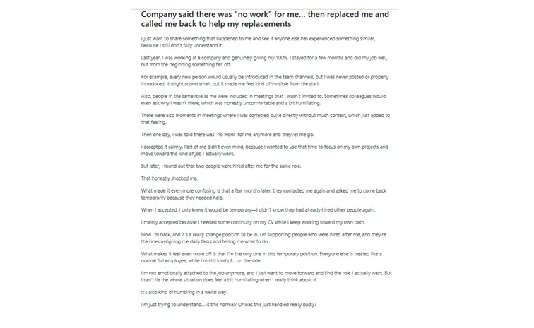 కొంతకాలం తర్వాత.. కంపెనీ తనను ఉద్యోగం నుంచి తొలగించింది. సంస్థ నిర్ణయాన్ని ప్రశాంతంగా స్వీకరించింది. కానీ తర్వాత.. అదే పని కోసం ఇద్దరిని కొత్తగా నియమించుకున్నారని తెలుసుకున్నప్పుడు ఆమెకు ఆశ్చర్యం కలిగింది. అంతే కాకుండా.. కొన్ని నెలల తర్వాత అదే కంపెనీ తనను మళ్లీ సంప్రదించి, తాత్కాలికంగా తిరిగి రావాలని కోరింది. కొత్తగా చేరిన ఉద్యోగులకు సహాయం చేయాల్సిన అవసరం ఉందని వారు తెలిపారు. ఉద్యోగ జీవితంలో గ్యాప్ రాకుండా ఉండాలని భావించి, ఆమె తిరిగి ఆ ఆఫర్ను అంగీకరించారు.