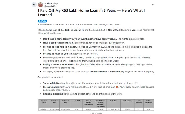 రూ.53 లక్షల లోన్ తీర్చడానికి తనకు ఆరు సంవత్సరాల కాలం పట్టిందని రెడ్దిట్ పోస్టులో వెల్లడించారు. అంతే కాకుండా నెలవారీ ఈఎంఐ మానసిక ఆరోగ్యంపై ఎలాంటి ఒత్తిడిని కలిగిస్తుందో కూడా పేర్కొన్నాడు.