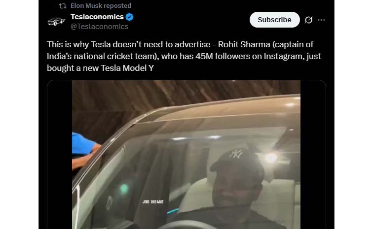''టెస్లా ప్రకటన చేయవలసిన అవసరం లేదు. ఇన్స్టాగ్రామ్లో 45 మిలియన్ల మంది అనుచరులను కలిగి ఉన్న రోహిత్ శర్మ (భారత జాతీయ క్రికెట్ జట్టు కెప్టెన్) కొత్త టెస్లా మోడల్ వై కొనుగోలు చేశారు''. అనే పోస్టు టెస్లా సహ వ్యవస్థాపకుడు ఎలాన్ మస్క్ దృష్టిని ఆకర్షించడంతో.. దానిని రీపోస్ట్ చేశారు. ఎక్కువమంది ఫాలోవర్స్ ఉండటం చేత ఈ కారు గురించి అందరికి తెలుస్తుందనే ఉద్దేశ్యంతో కంపెనీ ఈ ట్వీట్ చేసినట్లు తెలుస్తోంది.