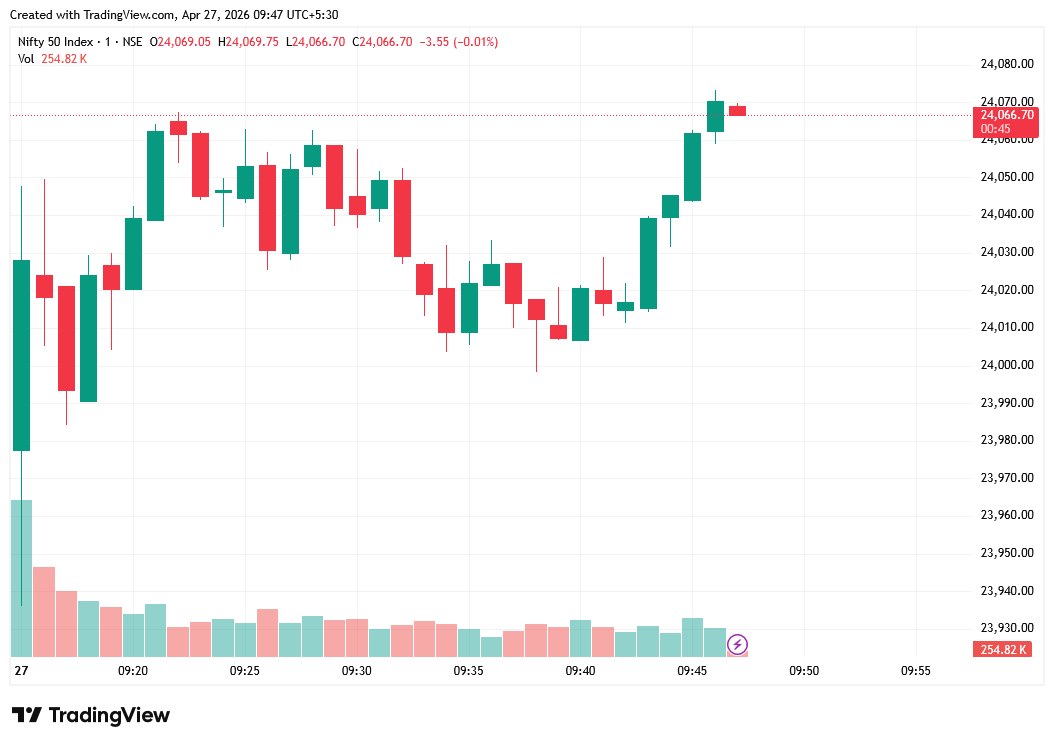 దేశీయ స్టాక్ మార్కెట్ సూచీలు సోమవారం లాభాల్లో కదలాడుతున్నాయి. ఈరోజు ఉదయం 9:43 సమయానికి నిఫ్టీ(Nifty) 118 పాయింట్లు పెరిగి 24,016 వద్దకు చేరింది. సెన్సెక్స్(Sensex) 378 పాయింట్ల లాభంతో 77,042 వద్ద ట్రేడవుతోంది.