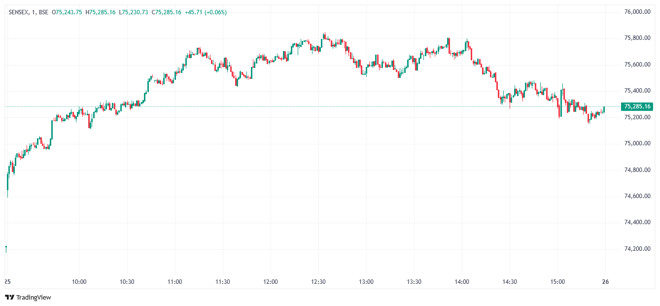 నిఫ్టీ 1.72 శాతం లేదా 392.70 పాయింట్ల లాభంతో 23,306.45 వద్ద, సెన్సెక్స్ 1.63 శాతం లేదా 1,205 పాయింట్లు పెరిగి 75,273.45 వద్ద ట్రేడవుతున్నాయి.