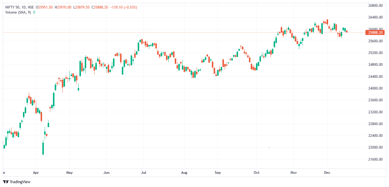 దేశీయ స్టాక్ మార్కెట్ సూచీలు గడిచిన సెషన్తో పోలిస్తే మంగళవారం నష్టాల్లో కదలాడుతున్నాయి. ఈరోజు ఉదయం 10:12 సమయానికి నిఫ్టీ(Nifty) 138 పాయింట్లు తగ్గి 25,890కు చేరింది. సెన్సెక్స్(Sensex) 464 పాయింట్లు నష్టపోయి 84,748 వద్ద ట్రేడవుతోంది.