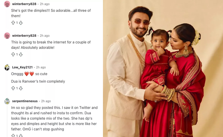 కుమార్తె దువా దీపావళి పూజ ఫోటోలను దీపికా పంచుకోవడంపై చాలా మంది సెలబ్రిటీలు, సహనటీనటులు స్పందించారు. డార్క్ మెరూన్ కలర్ డ్రెస్సు, రెండు చిన్ని పిలకలతో పాపాయి అందంగా ఉంది అంటూ నెటిజనులు, సో క్యూట్ అంటూ హన్సిక, రకుల్ ప్రీత్ సింగ్, పూజా హెగ్డే వంటి స్టార్ హీరోయిన్స్ మురిసిపోగా, దీపికా పదుకొనే కూతురు దువా ఫోటోలకు అలియా భట్ స్పందన విశేషంగా నిలిచింది. పాప ఫోటోలకు లవ్ ఎమోజీతో తన ప్రేమను ప్రకటించింది అలియా.