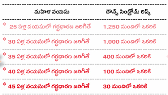 మహిళల్లో వయసు పెరుగుతున్న కొద్దీ డౌన్స్ సిండ్రోమ్ ముప్పు కూడాఅదే క్రమంలో పెరుగు తుందని పక్కన ఉన్నపట్టిక వల్ల తెలుస్తుంది.