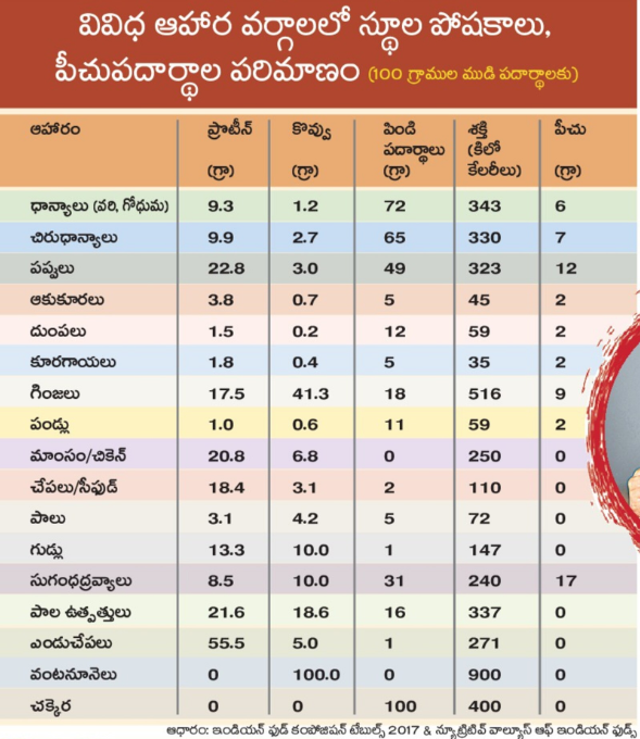 ఎన్ఐఎన్ సంకలనపరచిన ‘ఇండియన్ ఫుడ్ కంపోజిషన్ టేబుల్స్ 2017, న్యూట్రిటివ్ వాల్యూస్ ఆఫ్ ఇండియన్ ఫుడ్స్’లో సాధారణంగా వాడే 17 రకాల ఆహార పదార్థాల్లో పోషకాల వివరాలు పొందుపరిచింది. 100 గ్రాముల ముడి పదార్థాల్లో పిండి పదార్థం, మాంసకృత్తులు, కొవ్వులు, కేలరీలు ఎన్ని ఉన్నాయో పట్టిక రూపొందించింది.