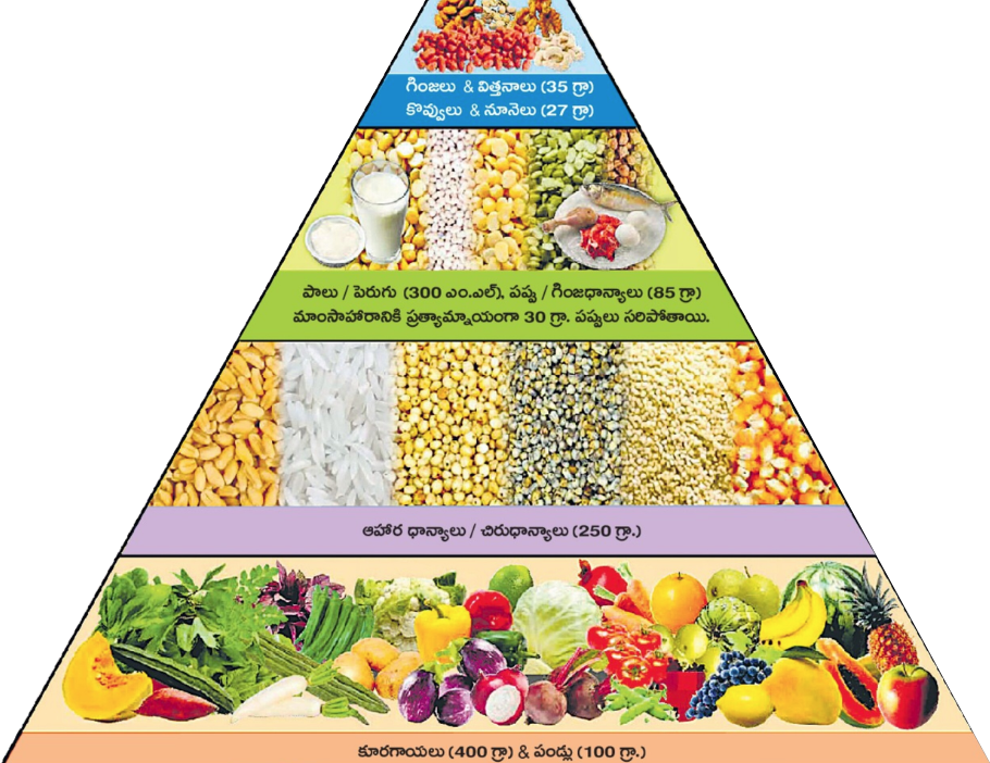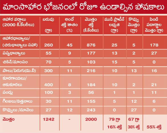 ఎన్ఐఎన్ మై ప్లేట్ ఫర్ ద డే సిఫారసుల(2024) ప్రకారం.. సగటున వ్యక్తి రోజుకు 2 వేల కిలో కేలరీల శక్తి అవసరం అనుకున్నాం కదా. వాటిని సమకూర్చుకోవాలి అంటే ప్రతి రోజూ ఆహారంలో పిండి పదార్థాలు 55%, 15% మాంసకృత్తులు, 30% కొవ్వు పదార్థాలు ఉండాలి. ఆహార పదార్థాల మోతాదు గ్రాముల్లో చెప్పుకోవాలంటే.. బియ్యం/ గోధుమలు వంటి ఆహార ధాన్యాలు, చిరుధాన్యాలు కలిపి 250 గ్రాములు, పాలు–పెరుగు 300 ఎం.ఎల్., కూరగాయలు 400 గ్రా., పండ్లు 100 గ్రా., పప్పులు, గుడ్లు, మాంసం ఉత్పత్తులు 85 గ్రా., పిక్కలు, గింజలు 35 గ్రా., నూనెలు/కొవ్వు పదార్థాలు 27 గ్రాముల మేరకు తీసుకోవాలి. మీరు మాంసాహారులా, శాకాహారులా అన్న దాన్ని బట్టి ఈ పాళ్లలో కొన్ని మార్పులు చేసుకోవాలి.