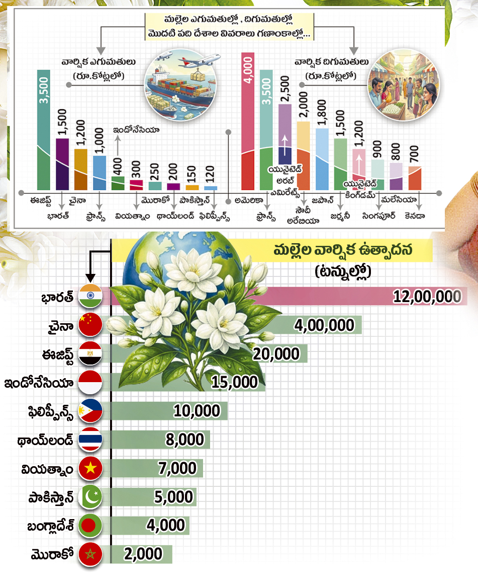 మల్లెల ఉత్పాదనలో మన దేశం మొదటి స్థానంలోనే ఉన్నా, ఎగుమతుల్లో మాత్రం రెండో స్థానంలో ఉంది. మన దేశంలో మల్లెల ఉత్పాదన స్థాయిలోనే స్థానిక వినియోగం కూడా భారీగానే జరుగుతుండటం దీనికి కారణం.