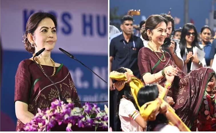 ఈ ప్రత్యేక సందర్భం కోసం, నీతా అంబానీ ప్రకృతిని స్ఫూర్తిగా తీసుకుని తనచీరను ఎంచుకోవడం విశేషం. సాధారణ ముదురు మెరూన్ చీరకు కాంట్రాస్ట్గా ఆకుపచ్చ రంగు అంచుతో కూడిన చీరను ఎంచుకున్నారు. ఇది ఆమెకు మరింత అందాన్ని ఇచ్చింది. ముందు భాగంలో కుచ్చులు పెట్టి, కొంగును తన భుజం నుండి నేల వరకు సింగిల్ పైటతో జారవిడిచారు.