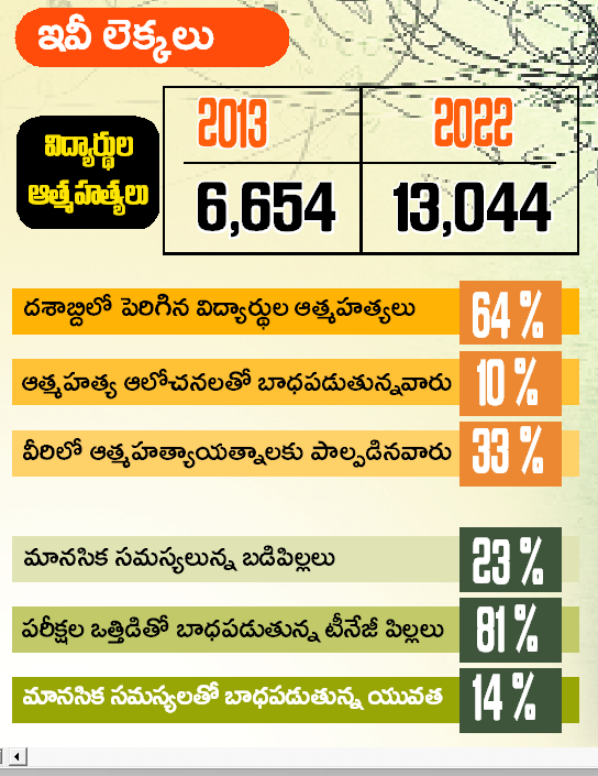 ఈ లెక్కలన్నీ ఏం చెప్తున్నాయి?. యువత, విద్యార్థుల మానసిక ఆరోగ్యం ప్రజా సమస్యగా మారుతోందని. ఇవి ఏవో కాకి లెక్కలు కాదు, ప్రతిష్ఠాత్మక జాతీయ సంస్థలు నిర్వహించిన సర్వేల్లో వెల్లడైన విస్తుగొల్పే వాస్తవాలు. విద్యాపరమైన ఒత్తిడి, తల్లిదండ్రుల ఆశలు, అధిక పోటీతో కూడిన విద్యా వ్యవస్థ విద్యార్థుల్లో ఆందోళన, నిస్ప ృహ, ఒత్తిడిని పెంచుతున్నాయి. ఈ సంక్షోభం తీవ్రమైన పరిణామాలకు దారితీస్తోంది, ముఖ్యంగా యువతలో ఆత్మహత్యల రేటు పెరగడం ఆందోళన కలిగిస్తోంది.