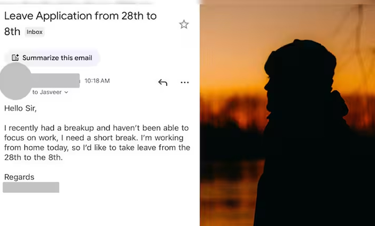 గురుగ్రామ్లోని నాట్ డేటింగ్ కో ఫైండర్, సీఈవో జస్వీర్ సింగ్ తన కంపెనీ ఉద్యోగి లీవ్ కు సంబంధించిన ఒక మెయిల్ సెలవు స్క్రీన్షాట్ను షేర్ చేశారు. అందులో ఇటీవల బ్రేకప్ అయింది సార్, లీవ్ కావాలి.. పనిమీద దృష్టి కేంద్రీకరించలేకపోతున్నాను. కొంత సమయం కావాలి. 28వ తేదీ నుంచి 8వ తేదీ వరకు (దాదాపు 11 రోజులు) సెలవు తీసుకోవాలని అనుకుంటున్నాను." అంటూ లీవ్ కోసం దరఖాస్తు చేశాడు. అతనికి లీవ్ మంజూర్ చేశారట. సింగ్ దీనిని తాను అందుకున్న "అత్యంత నిజాయితీగల సెలవు దరఖాస్తు"గా అభివర్ణించడం తోపాటు, జెన్ జెడ్ (Gen Z) ఏదీ దాచుకోదు అంటూ కమెంట్ చేయడం విశేషం.