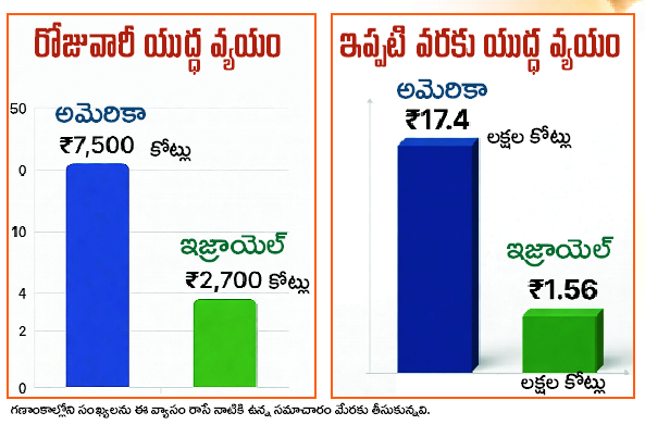 యుద్ధం మొదలైన మొదటి ఆరు రోజుల్లోనే అమెరికా ఏకంగా రూ.1.01 లక్షల కోట్లు ఖర్చు చేసింది. యుద్ధం ప్రభావం వల్ల అమెరికా ఆర్థిక వ్యవస్థపై ఇప్పటి వరకు పడిన భారం దాదాపు రూ.17.4 లక్షల కోట్లు ఉండవచ్చని ఆర్థిక నిపుణుల అంచనా. ఇరాన్పై దాడుల కోసం ఇజ్రాయెల్ వారానికి సగటున రూ. 27,000 కోట్లు ఖర్చు చేస్తోంది. ఇజ్రాయెల్ ఇప్పటి వరకు రూ.1.56 లక్షల కోట్లు ఖర్చు చేసినట్లు అంచనా. యుద్ధం కోసం అమెరికా రోజువారీగా సగటున రూ. 7,500 కోట్లు, ఇజ్రాయెల్ రోజువారీగా సగటున రూ. 2,700 కోట్లు చొప్పున ఖర్చు చేస్తున్నట్లు అంతర్జాతీయ నివేదికలు చెబుతున్నాయి.