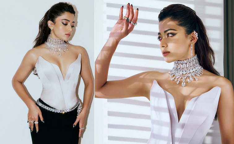 గౌరవ్ గుప్తా రాబోయే హాలిడే 2026 కలెక్షన్ నుంచి రష్మిక మందన్న బెస్పోక్ పెటల్ కార్సెట్ స్కల్ప్ట్ ఫ్రాక్ ధరించింది. దీనికి హై-వెయిస్టెడ్, ఫ్లోర్-లెంగ్త్ బ్లాక్ స్కర్ట్తో జత చేసింది. ఇంకా అద్భుతమైన స్వరోవ్స్కీ ఆభరణాలు రష్మిక్ గ్లామర్ లుక్ను పెంచాయి. మాస్టరీ ఆఫ్ లైట్ థీమ్కు సరిపోయేలా, ఆమె అష్టభుజి-కట్ క్రిస్టల్స్ ఐకానిక్ మిలీనియా చోకర్ను ధరించింది. స్వరోవ్స్కీ నెక్లెస్, రెండు ఇయర్ కఫ్లతో పాటు సరిపోయే డాంగ్లర్ చెవిపోగులను కూడా ధరించింది. అలాగే రోడియం ప్లేటింగ్తో అలంకరించబడిన భారీ స్టేట్మెంట్ నడుం బెల్ట్ కూడా అందంగా అమిరి మెడ్రన్ లుక్ను తెచ్చిపెట్టాయి. దీంతోపాటు, ఫోటోగ్రాఫర్ల కోసం ఫోజులిస్తున్నపుడు కనిపించిన రింగ్, ఎంగేజ్మెంట్ రింగ్ అనే ఊహాగానాలు మాత్రం జోరుగా ఉన్నాయి.