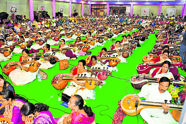 తెనాలి: శ్రీదేవీ నవరాత్రి మహోత్సవాల్లో భాగంగా మూలా నక్షత్రం రోజైన సోమవారం సాయంత్రం తెనాలిలో 108 వీణల ఘన సప్తస్వర సమ్మేళనం (వీణా సింఫనీ) నిర్వహించారు. పెనుగొండ క్షేత్ర పీఠాధిపతి శ్రీప్రజ్ఞానంద సరస్వతి (బాల స్వామీజీ) ఆధ్వర్యంలో 108 మంది వైణికుల వాద్య స్వర తరంగాలు ఒకే సమయాన ఆడిటోరియంలో ఆవహించాయి. దివ్యానంద సుడిగాలిలా భక్తులను చుట్టుముట్టాయి. స్థానిక చెంచుపేటలోని పద్మావతి కల్యాణ మండపంలో ఈ ఆధ్యాత్మిక సంగీత యజ్ఞాన్ని వేడుకగా చేశారు. బాలస్వామీజీ స్వయంగా వీణావాదన చేశారు. సరస్వతీ దేవికి ప్రీతిపాత్రం వీణ అని తెలిసిందే. వీణ ధ్వనిని వేదమంత్రాల నాదంతో సమానంగా పరిగణిస్తారు. ఇక 108 సంఖ్య హిందూ సంప్రదాయంలో పవిత్రమైనది. జపమాలలో ఉండే గింజల సంఖ్య 108. అంతమంది వైణికులు ఒకేసారి వీణ వాయించటమంటే జపమాల గింజల్లా ప్రతి స్వరం ఒక మంత్రధ్వనిగా మారటం అన్నమాట! శ్రోతలలో భక్తి, శాంతి, ఆనందం, ఆత్మశుద్ధిని కలిగించే ఆధ్యాత్మిక యజ్ఞంలా జరిగింది. పట్టణానికి చెందిన శ్రీ విద్యా పీఠం, సాలిగ్రామ మఠం, జయలక్ష్మి మాతృమండలి ఆధ్వర్యంలో నిర్వహించారు. ఆయా సంస్థల బాధ్యులు నంబూరి వెంకటకృష్ణమూర్తి, పెనుగొండ వెంకటేశ్వరరావు, రావూరి సుబ్బారావు, ముద్దాభక్తుని రమణయ్య, పల్లపోతు మురళీ మనోహర్, కుమార్ పంప్స్ అధినేత కొత్త సుబ్రమణ్యం, గోపు రామకృష్ణ, రాజేశ్వరరావు, కమిటీ సభ్యులు, జయలక్ష్మి మాతృమండలి సభ్యులు పాల్గొన్నారు.