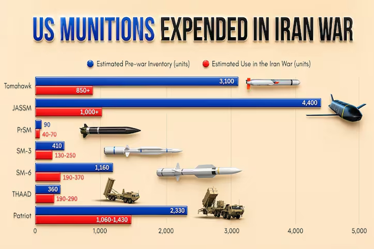 పాట్రియట్ PAC-3: 2,330 ఉండగా.. 1,060–1,430 వినియోగించబడ్డాయి. కేవలం 900 మాత్రమే మిగిలాయి.