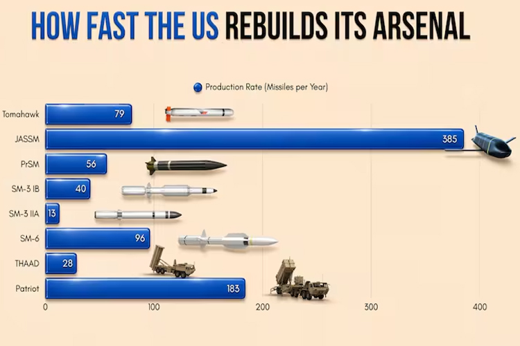ఉత్పత్తి చేయడానికి ఎక్కువ సమయం పట్టడం కారణం (టోమాహాక్ – 47 నెలలు, THAAD – 53 నెలలు, SM-36 నెలలు, SM-36 నెలలు) కావడంతో నిల్వలను తిరిగి భర్తీ చేయడం కష్టతరం అవుతుంది.